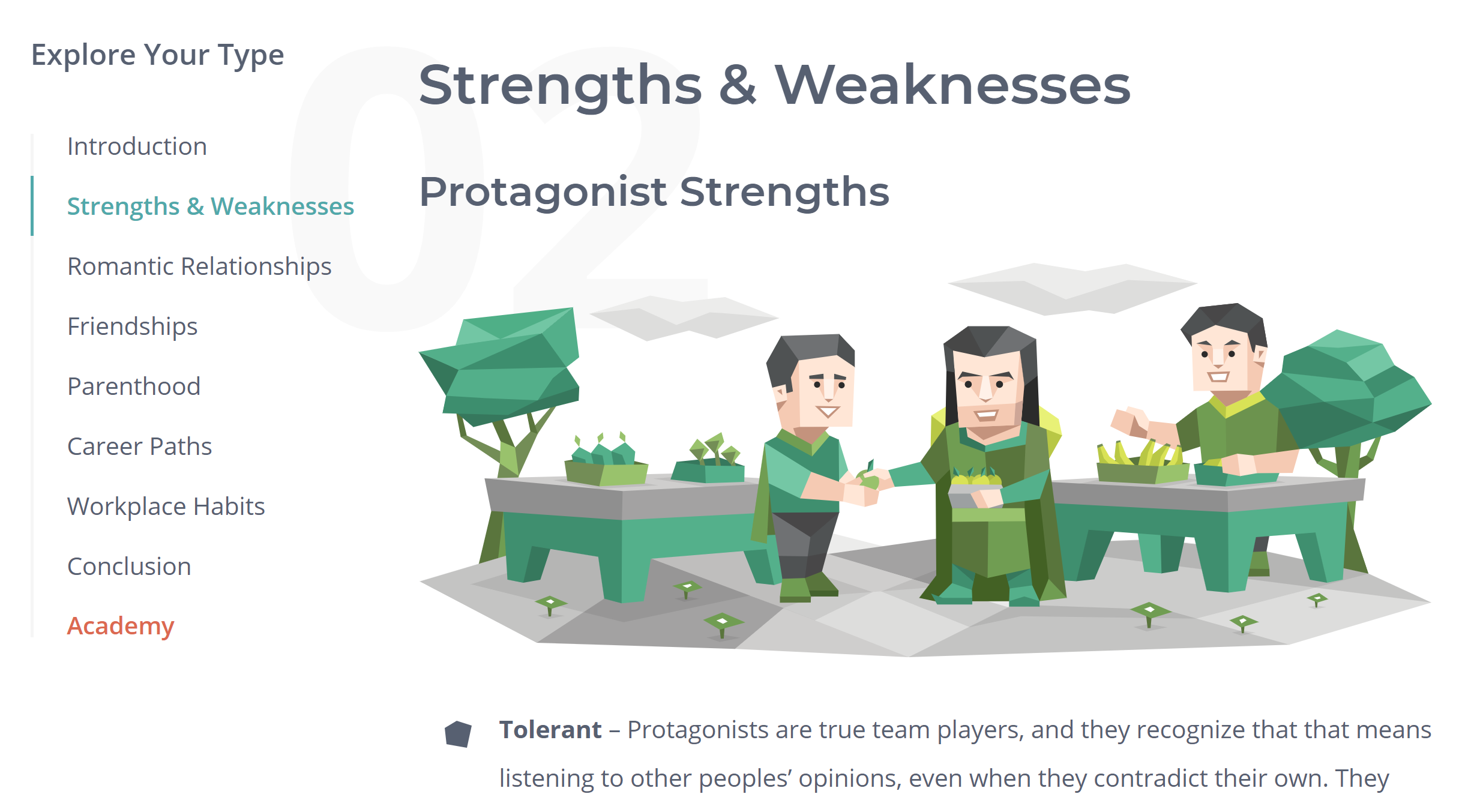 테스트 결과에 맞춰 강점과 단점, 커리어 패스, 로맨스 관계도 설명하는데 이 부분은 영어로 작성되어 있습니다. 영어가 그렇게 어렵지 않게 작성되어 있으니 공부하실 겸 읽어보시는 것도 좋은 방법 같습니다. :-)