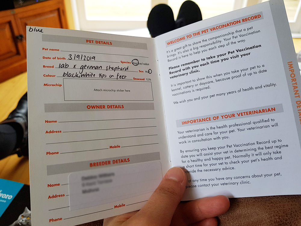 접종 카드 앞에는 강아지가 태어난 날, 브리드(Breed) 강아지 견종, 색상 등이 적혀 있습니다.