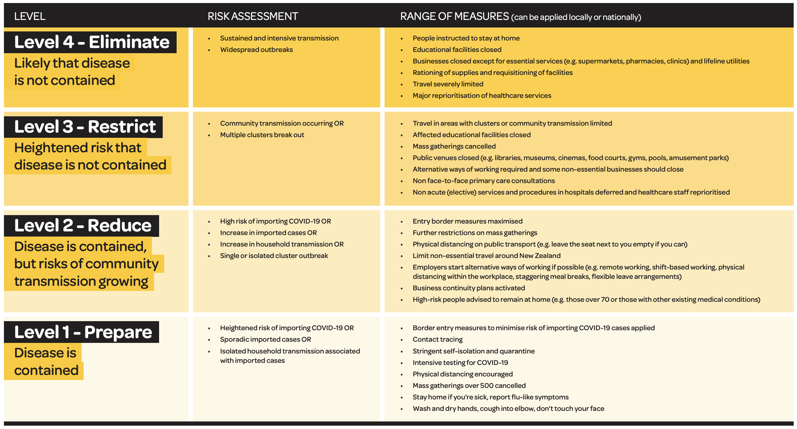 제신다 아던은 담화를 통해 코로나 바이러스에 대한 알람을 4단계로 나누어 어떤 행동방침을 따라야 하는지 설명하였습니다. 이틀 전만 해도 경고 2단계로 지정하였는데, 이에 따른 행동방침은 70세가 넘는 국민들은 감염을 방지하기 위해 최대한 집에 있으라는 방침이었습니다.