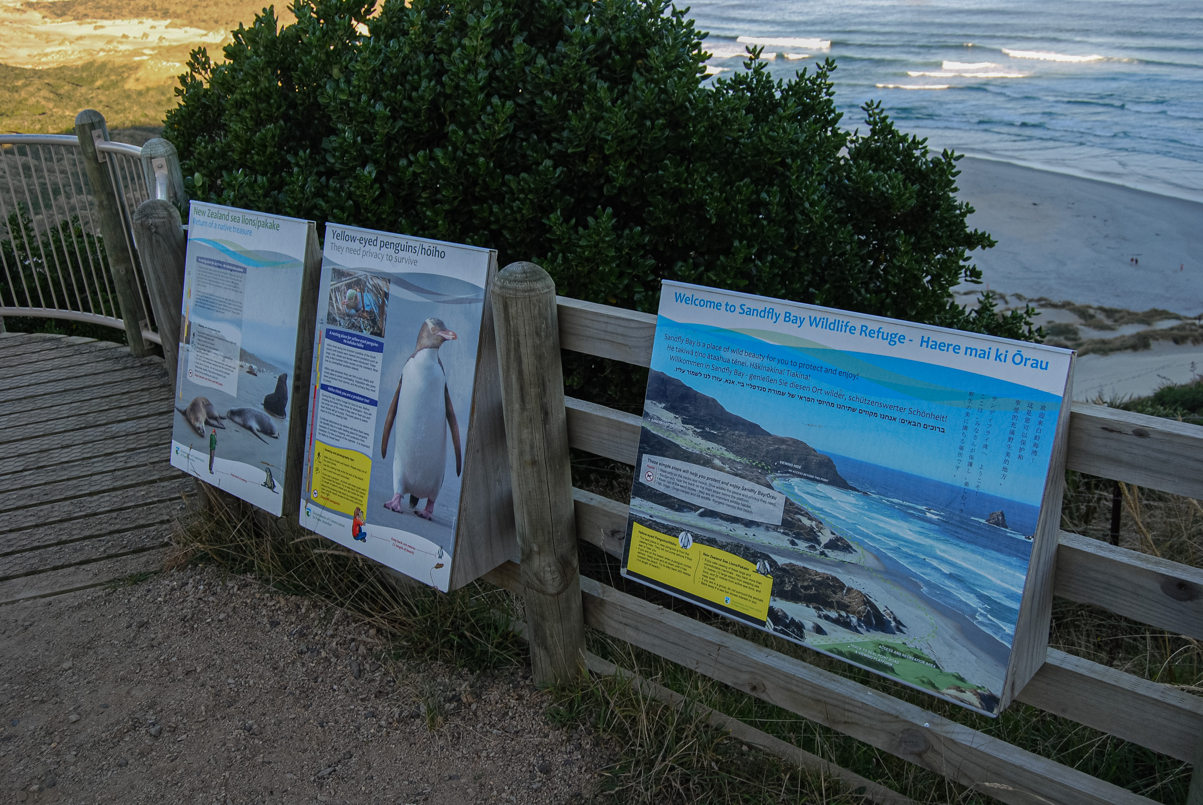 이 지역에 노란 눈을 가진 팽귄과 물개들을 볼 수 있다는 팻말 및 주의사항들을 볼 수 있습니다. 야생동물들의 서식지라 만약에 보게 된다면 그들이 최대한 불편하지 않은 선에서 거리를 유지하도록 합니다. 그리고 실제로 널부러져 자는 물개를 발견할 수 있었습니다.