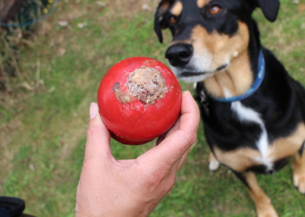 성인이 되고나서 부터는 거의 장난감을 사용하지 않게 되었고, 간식을 줄 때 조금 더 재밌게 먹을 수 있도록 하는 장난감 정도만 쓰고 있습니다. (아래 사진) 대신에 코나가 테니스 공 던지는 걸 받는 놀이에 완전 빠져서, 공 던지기를 많이 하는데요.