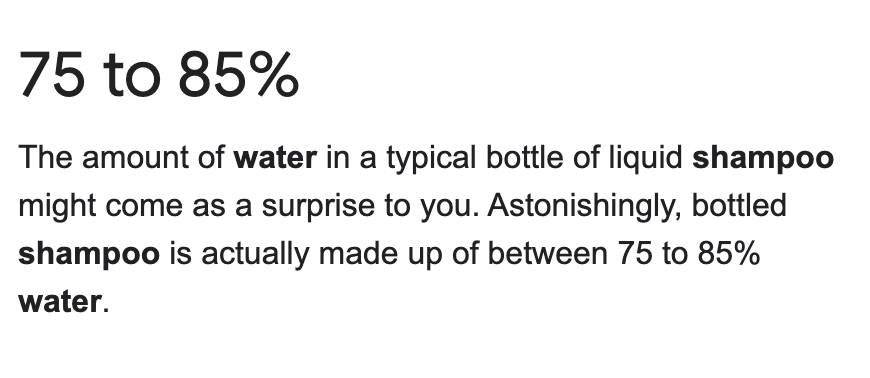 일단 샴푸와 린스의 대략적인 성분에 대해 알아보지 않을 수 없습니다. 여러 웹사이트들을 검색한 결과 무려 보통 80% 정도 샴푸통에 있는 성분이 물이라는 것에 놀라지 않을 수 없습니다. 질소를 샀더니 과자가 나왔다는 말이 나온 것 처럼, 사실 우리는 물을 비싼 가격에 주고 구매하는 것이나 다름이 없었습니다.