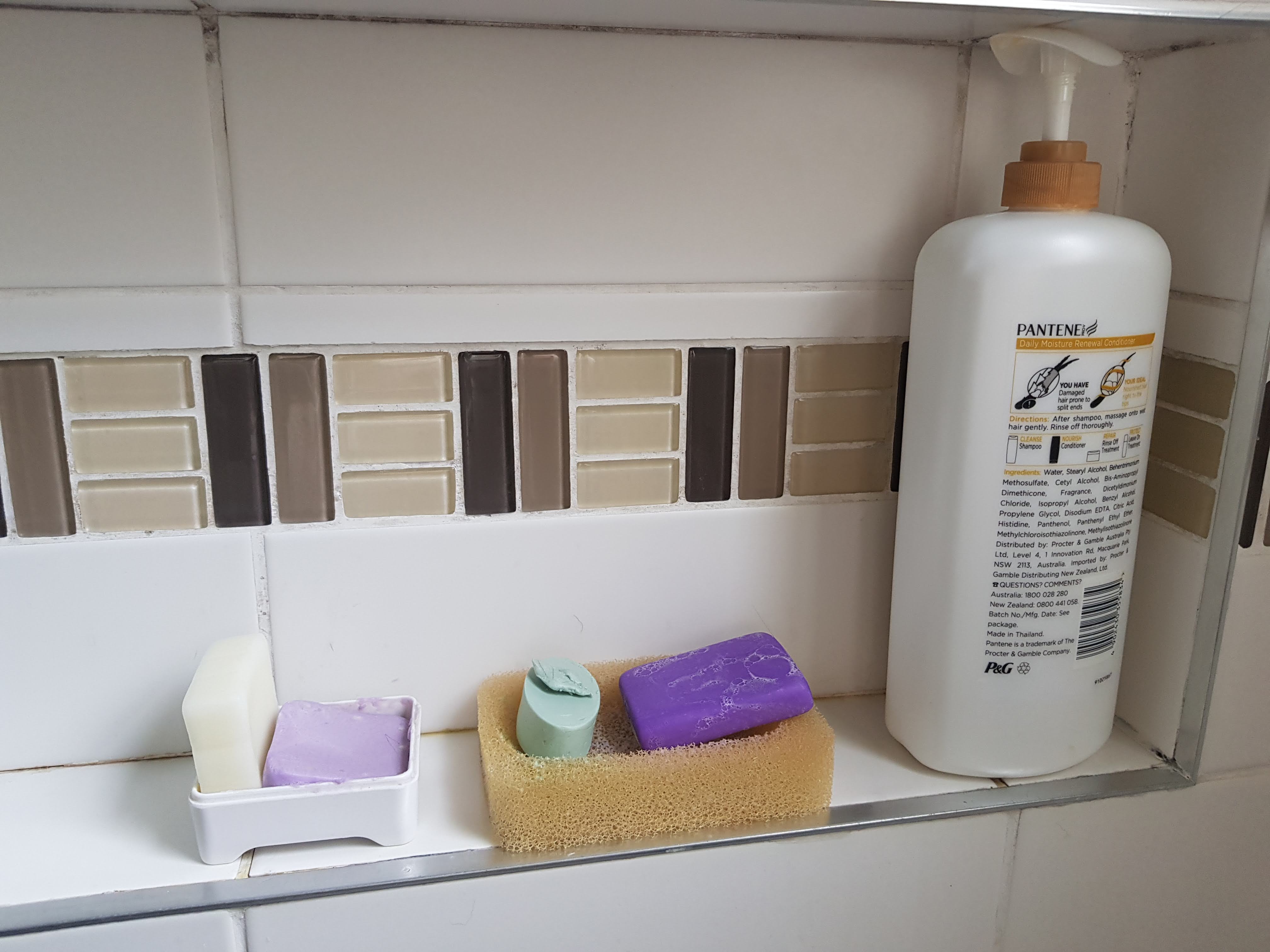 왼쪽부터 흰색 컨디셔너(린스) - 샴푸 (옅은보라) - 클랜징 폼 (쑥색) - 그리고 샤워젤 대신 쓰는 바디클렌징 (짙은 보라)가 있습니다.