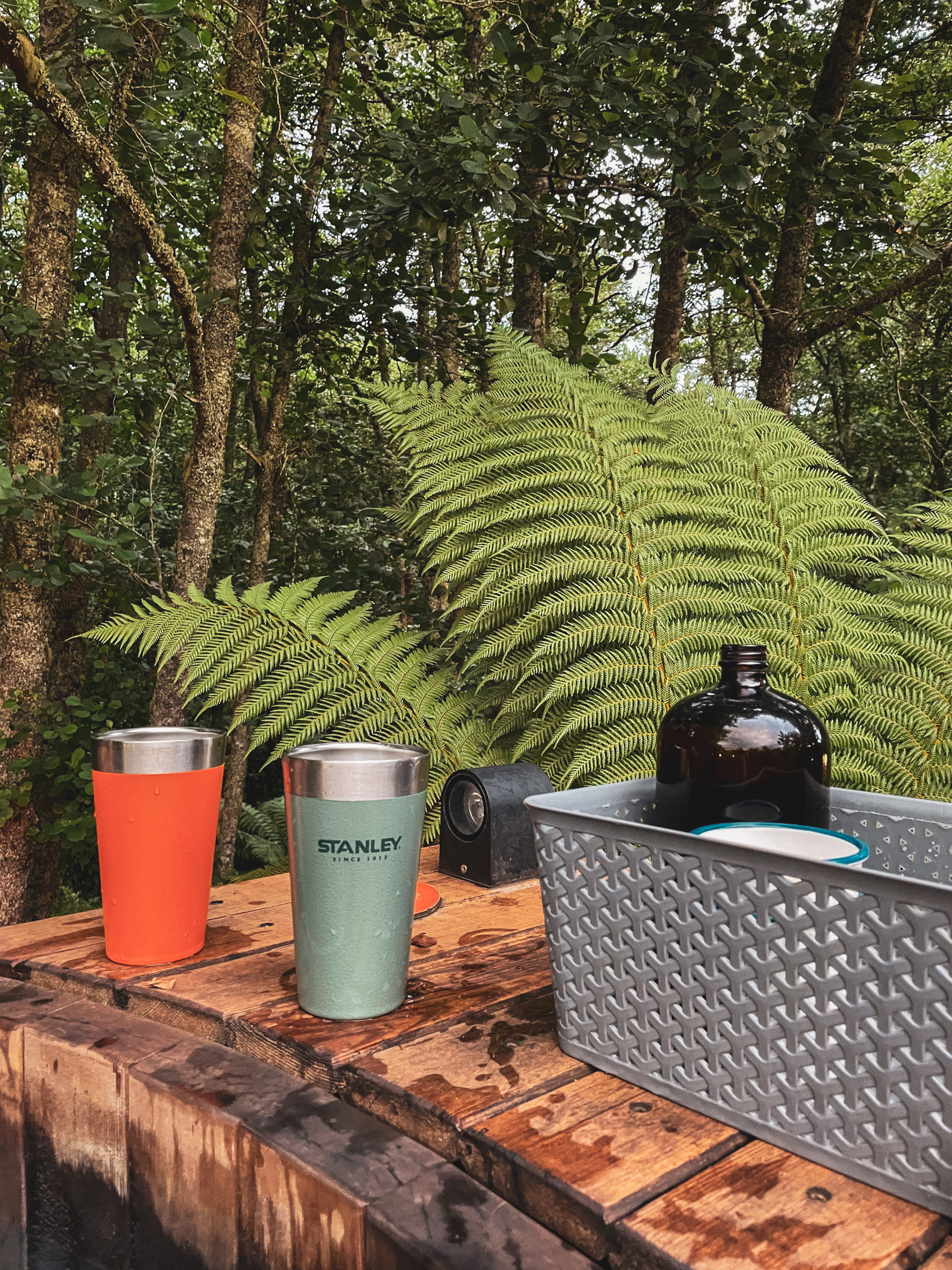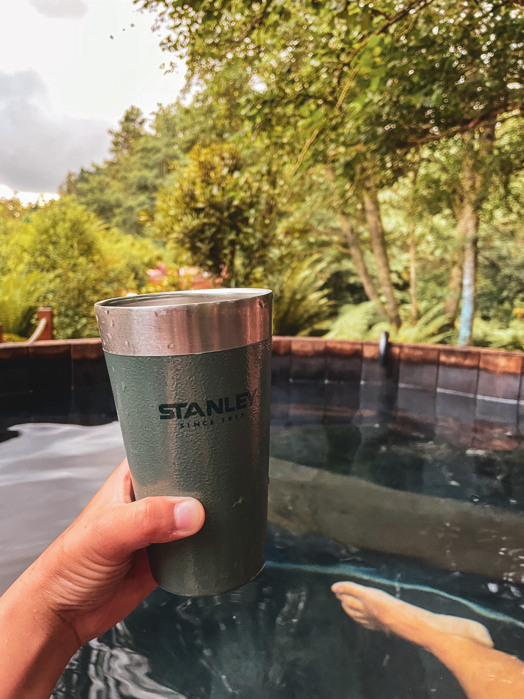 저희는 미리 핫풀에 들어가기 전에 맥주와 사이다를 시켰습니다. 일반 컵이 아니라 보온/냉온을 할 수 있는 컵에 담아져서 핫풀을 즐기는 동안 차게 마실 수 있게 배려한 컵입니다. 그리고 그 옆에는 생수가 비치 되어있어 뜨거운 물에 어지러움이나 갈증이 생길 때 마실 수 있게 배치해 두었습니다.