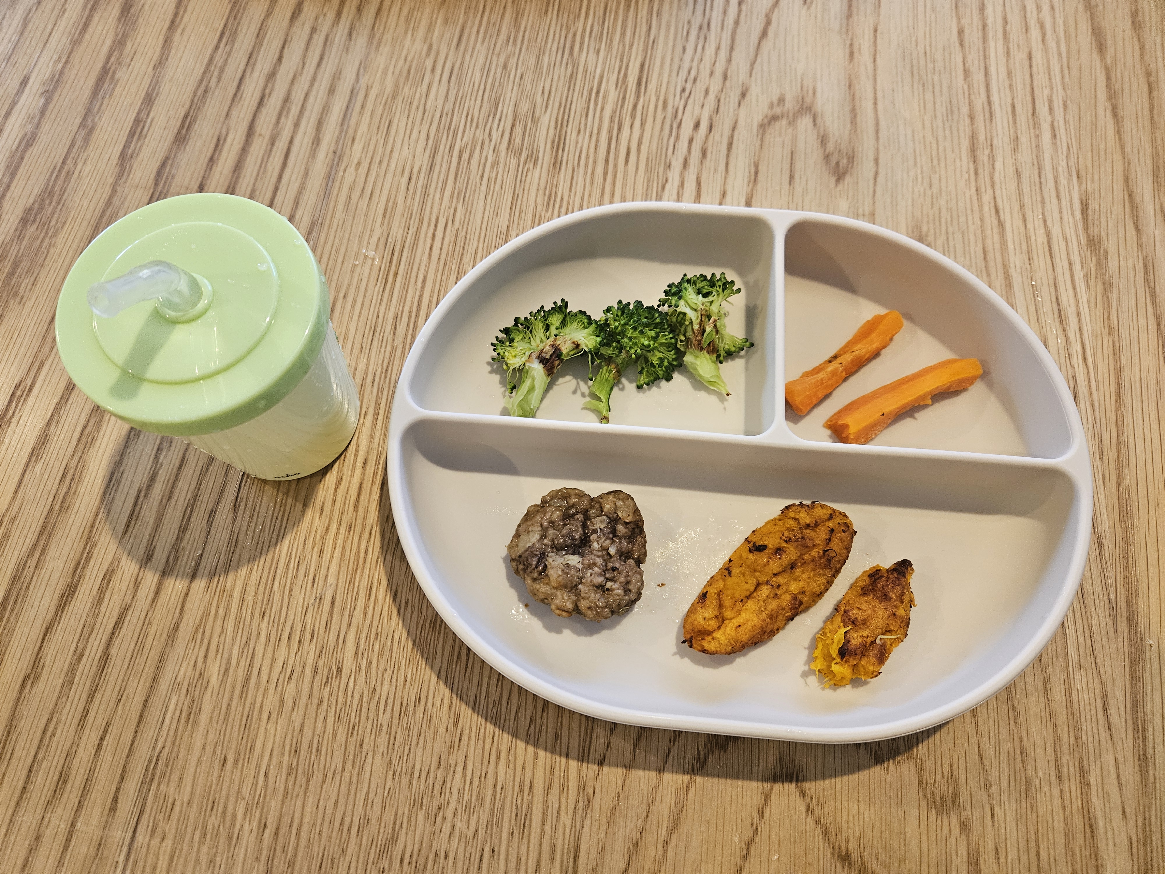 자기주도 이유식의 단점이라고 한다면 아기가 식판을 엎기도 하고 난장판을 만들어서 입에 정작 들어가는 게 얼마 없어서, 개인적으로는 영양적으로나 정신적?으로나 한동안은 숟가락에 떠 먹여주는 방향으로 갈 것 같다. 두끼는 한국식, 한끼는 외국식.