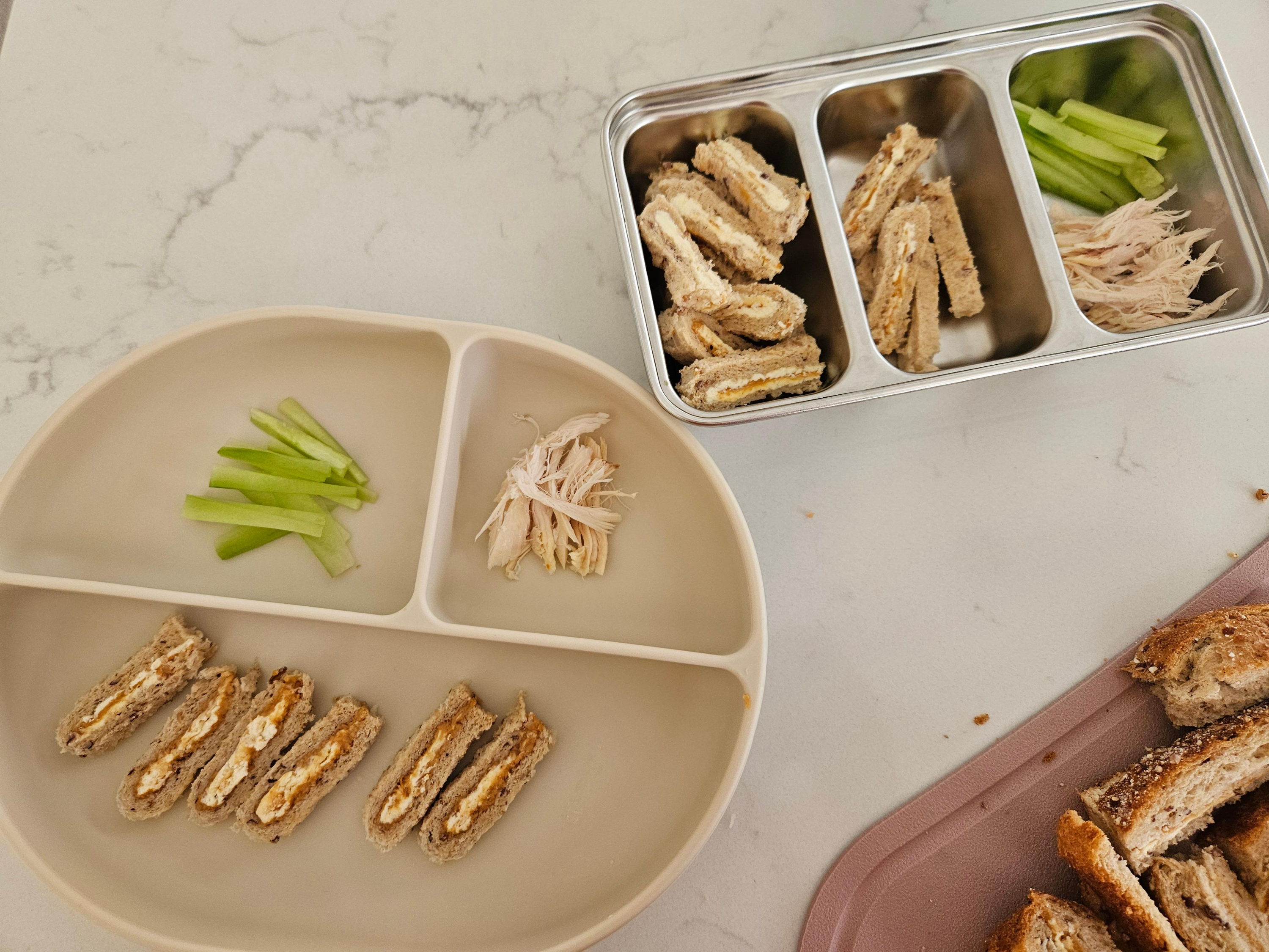 이건 나만 국한된 이야기일 수도 있지만, 개가 있는 집이라 아기 스케줄 중에 꼭 한번은 산책 아니면 좀 길게 밖에 나가는 경우가 많아서, 아기가 갑자기 배고파지거나 혹시 모를 경우의 수를 대비해 음식을 가방에 항상 대비한다. (6개월 이후부터) 스낵과 같이 과자를 넣기도 하지만, 주로 아기 아침을 만들어줄 때 조금 더 만들어서 아침+도시락을 같이 싸는 루틴을 만들었었다. 밖에서 사 먹을 수도 있지만 애기가 먹을 수 있는 게 꽤 한정적이다. 그래서 도시락 컨테이너 같은 걸 한국에서 주문했는데, 알차게 사용하고 있다.